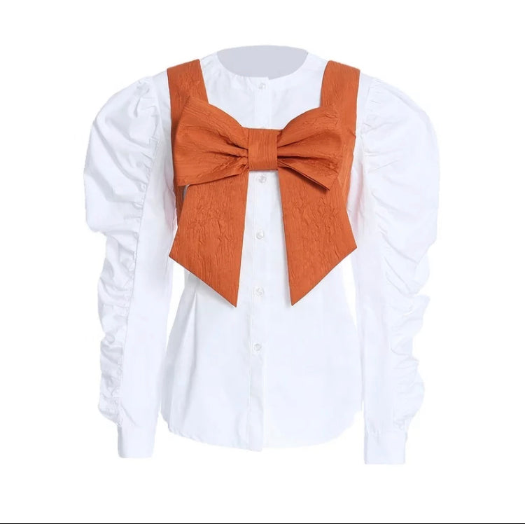Shirt: White Button-Up w/Puff Sleeves,Β Bow Tie Bib: Orange Bow. Back Buttons. Embroidery Texture. Flaps can be worn down or across.