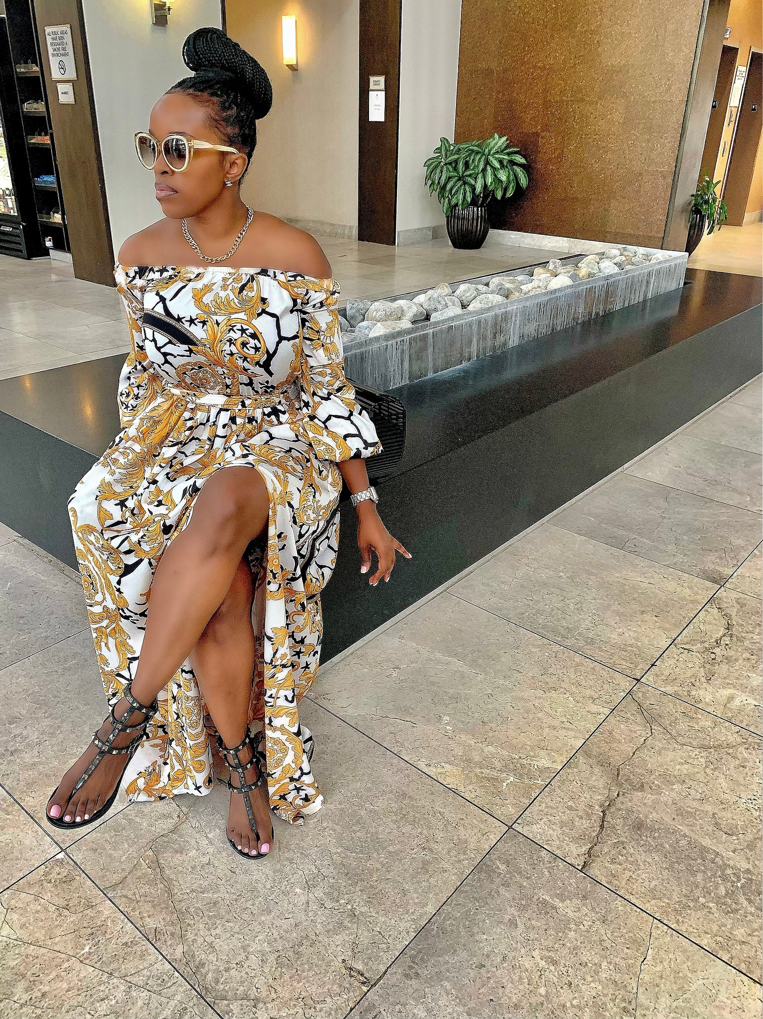Printed Off Shoulder. Woven Maxi Dress. w/Pockets. Front Slit.