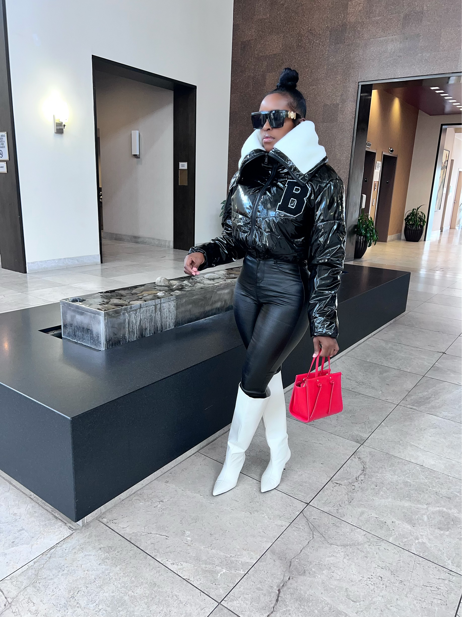 Patent Leather Varsity Bomber. Long Sleeve. Sherpa Collar. Front Zipper. Waist Length.